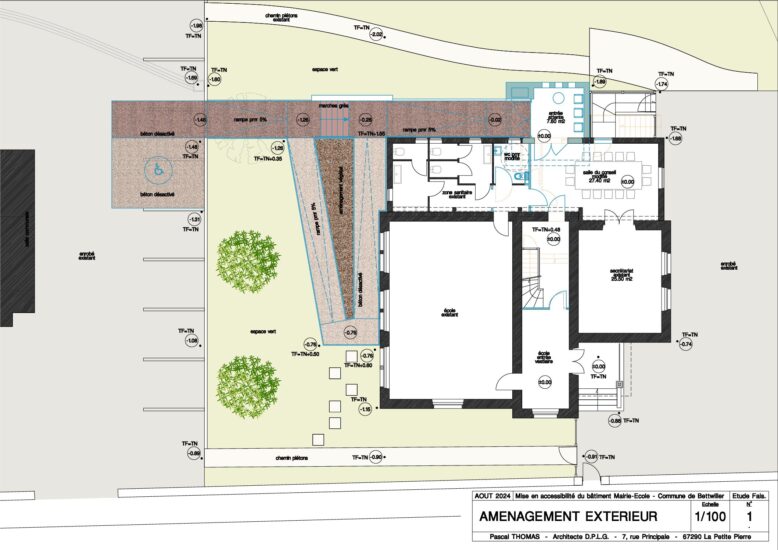 Le projet consiste en la mise en conformité PMR avec la création d’une rampe d’accès au bâtiment école-mairie, ainsi que l’aménagement d’un sas d’entrée pour l’accès mairie.